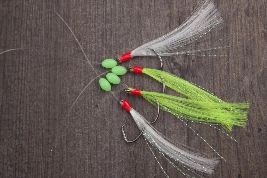 Dieses Makrelenvorfach ist mit vier Circle Hooks, Fluolockperlen und weißen und chartreusen Federn ausgestattet.