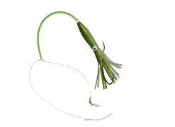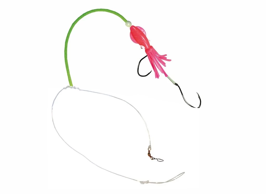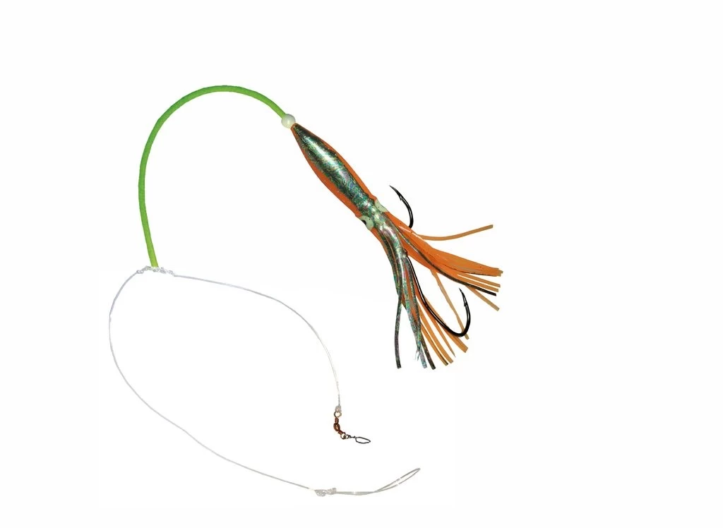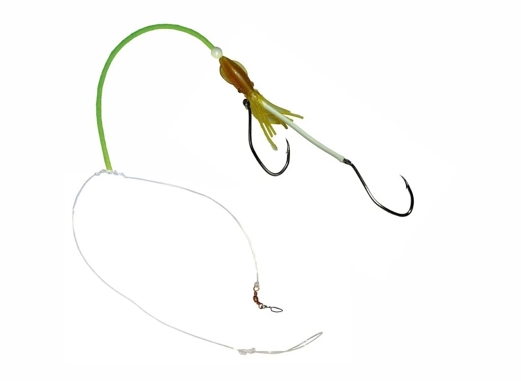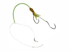 Dieses Spezial-System baut Enrico Wyrwa auf Hitra, um die ganz großen Leng an den Haken zu bekommen. Extra starke Materialien, eine Schnurverbindung ohne Knoten – in einem Stück. Die 1,20mm starke monofile Schnur ist doppelt gebunden und wird von dem Leucht-Schutz-Schlauch geschützt. Sicherer gehts nicht! Im Gegensatz zu System II verfügt dieses System über zwei Einzelhaken der Größe 10/0, an denen ein Fischfilet präsentiert wird. Da der Leng sehr argwöhnisch ist und den Köder nur mag, wenn dieser nahezu naturgetreu angeboten wird. Das Filet sollte wie eine Handfläche montiert sein, damit es im Wasser wie ein Fisch flattert. Ein einfacher Fleischklumpen wird oft verschmäht. Es gibt sechs verschiedene Farben und zwei unterschiedliche Oktopusse als B2 mit 10cm (alle anderen Farben) und Hogy Oktopusse der Größe 20cm (oliv + crab). Am Ende des Vorfaches befindet sich noch ein starker Sicherheitswirbel der Größe 3/0. Aus produktionstechnischen Gründen kann es vorkommen, dass die Farben der Oktopusse leicht abweichen bzw. sich ändern.