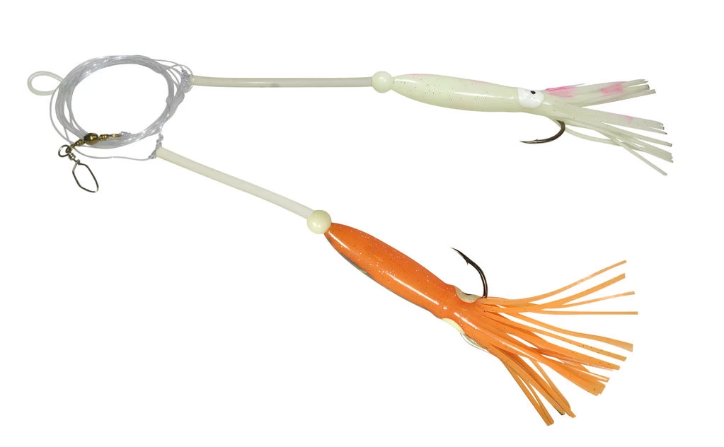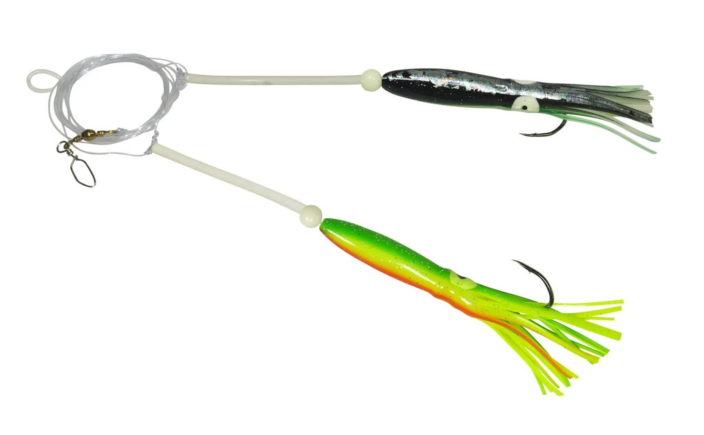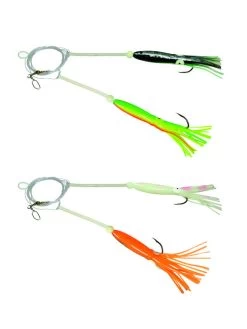 Diese Spezial-System baut Enrico Wyrwa auf Hitra, um die vermehrt vorkommenden Seehechte zu erbeuten. Beim Seehecht handelt es sich um einen neuen Zielfisch im Atlantik. Die Seehechte werden gezielt beangelt und dieses macht richtig Spass, denn es sind kampfstarke Fische. Genau für diese Fische wurden diese Systeme entwickelt. Da der Fisch sehr scharfe Zähne hat, müssen wir zum einen sehr spitze und scharfe Haken verwenden und zum anderen die Mundschnur mit einem äußerst bissfestem Schlauch ummanteln. Diese ist hoch selbstleuchtend, welches die Beisslaune der Seehechte erhöht. Die Mundschnur ist doppelt geschlauft und bietet somit doppelte Sicherheit. Ebenfalls ist das System knotenlos geknüpft, damit wir keine Schwachstellen haben. Diese System bietet zwei Anbisstellen mit größerem Abstand, um die Naturköder auf einer größeren Wassersäule präsentieren zu können. Somit haben wir die große Chance die Fische besser zu finden und auch zwei Fische gleichzeitig zu fangen. Die Systeme haben zwei Hogy-Oktopusse, 2 Stahl-Carbonhaken der Größe 6/0, Leuchtschläuche und Leuchtperlen.