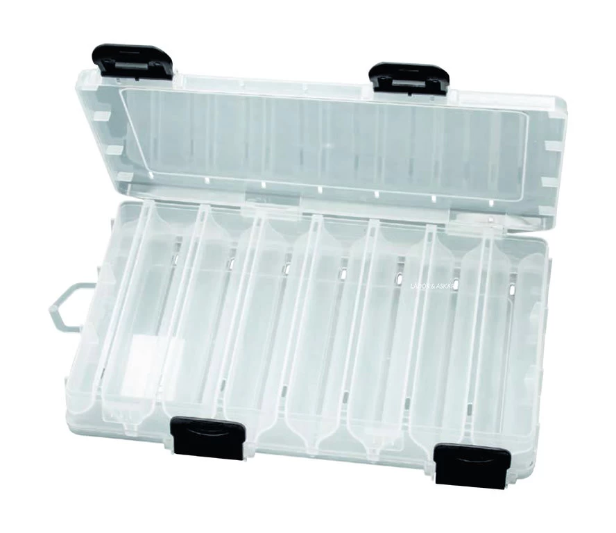 Die Box ist ideal für die Aufbewahrung von Kunstködern, wie Blinker oder mittlere Pilker. Sie ist von beiden Seiten befüllbar und besitzt auf jeder Seite sieben Y-förmige Einteilungen zur Aufbahrung der Köder. Durch diese Aufteilung finden viele Kunstköder auf kleinsten Raum platz. Die Größe der Box beträgt 27 X 17 X 4,3cm.