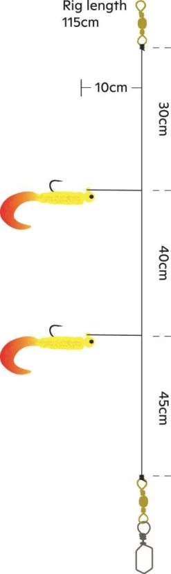 Diese einzigartige System verfügt über zwei klassische Twister mit schweren Zinkköpfen, effektiven UV-Farben und starken Haken. Mit den schweren Köpfen bewegt und fischt sich diese Montage absolut einzigartig