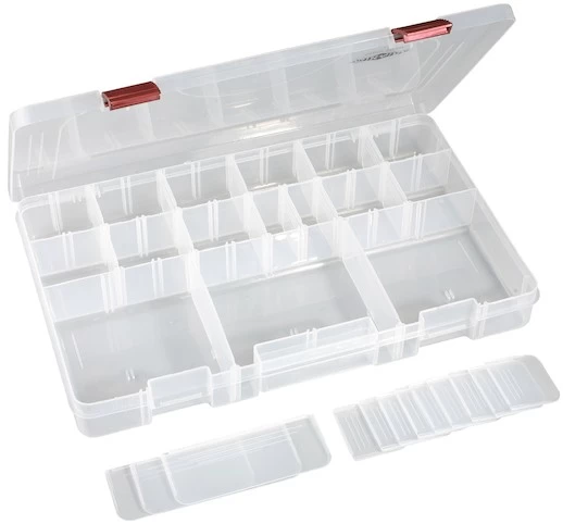Diese Zubehörbox hat eine GröĂe von 35 x 22 x 5cm. Sie ist individuell einteilbar und damit optimal fĂŒr die Aufbewahrung von Blinkern, Spinnern oder sonstigen Zubehör geeignet. Sie ist einer sehr gute ErgĂ€nzung des MIKADO Taschenprogramms.