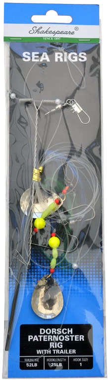 Dieses Dorschvorfach besitzt zwei Haken, Lockperlen und Spinnerblätter. Es hat einen Trailer und einen Abstandshalter und zwei Haken der Größe 1. Die Hauptschnur hat eine Tragkraft von 52lb (24kg) wobei die Vorfachschnur der Seitenarme eine Tragkraft von 25lb (11kg) aufweist.