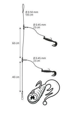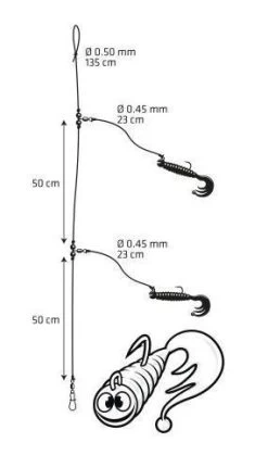 Dieses spezielle Vorfach ist für den Fang von Dorsch konzipert worden. Es gibt zwei verschiedene Ausführungen. Der Unterschied zwischen beiden Varianten besteht im Abstand der Seitenarme zueinander und dem Abstand zum Grundwirbel. Die erste Variante ist 50/50 geteilt, dass bedeutet der Abstand zwischen den beiden Seitenarmen und dem Grundwirbel beträgt 50cm. Bei der zweiten Variante 40/60 ist der Abstand zwischen den Seitenarmen 60cm und der Abstand zum Grundwirbel 40cm. Beide Vorfachvarianten besitzen eine 0,50mm starke Hauptschnur und die Seitenarme eine Stärke von 0,45mm. Die Tragkraft der Vorfächer ist mit 17kg angegeben. Es gibt vier verschiedene Farben, in denen die Twisterschwänze eingefärbt wurden. Die Twister mit Curly Tail haben eine Länge von 7,5cm und sind an einem 3,5g Trophy LOOky Jig-Kopf der Hakengröße 3/0 befestigt. Die Vorfächer haben eine Länge von 135cm und die Seitenarme sind 23cm lang.
